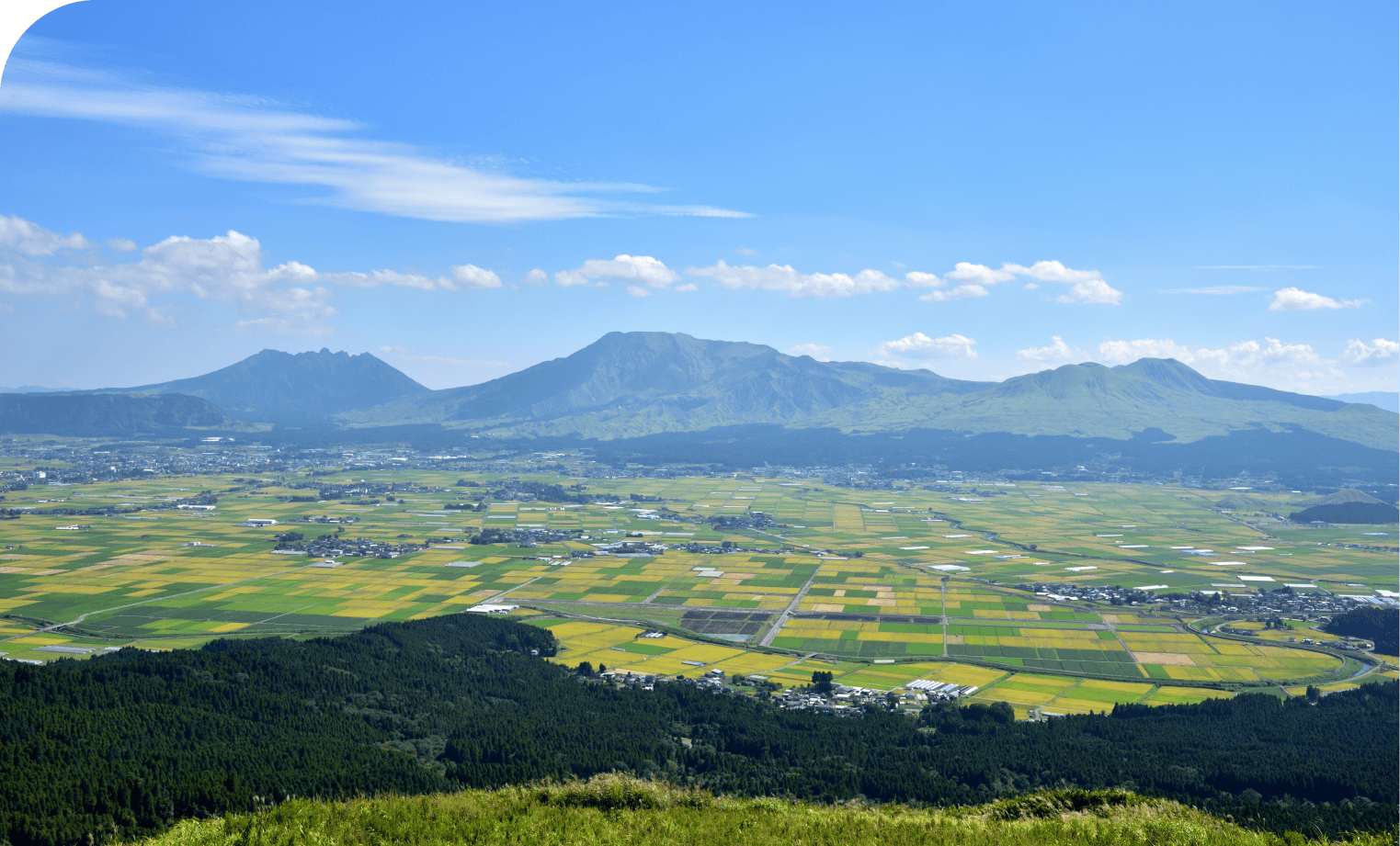 熊本県では、天草などの海から、阿蘇などの標高の高い山間地域まで変化に富んだ地形や気候を活かして、米や野菜、果物、花き、畜産などたくさんの農畜産物が生産されています。